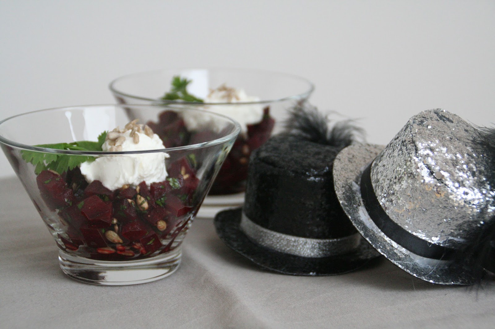 Und wenn ihr noch eine Idee für schnelle Silvester-Leckereien braucht: Ich hätte noch Rote-Bete-Salat mit einer Ziegenfrischkäse-Meerrettich-Haube und frischen Avocado-Tomaten-Salat im Angebot.