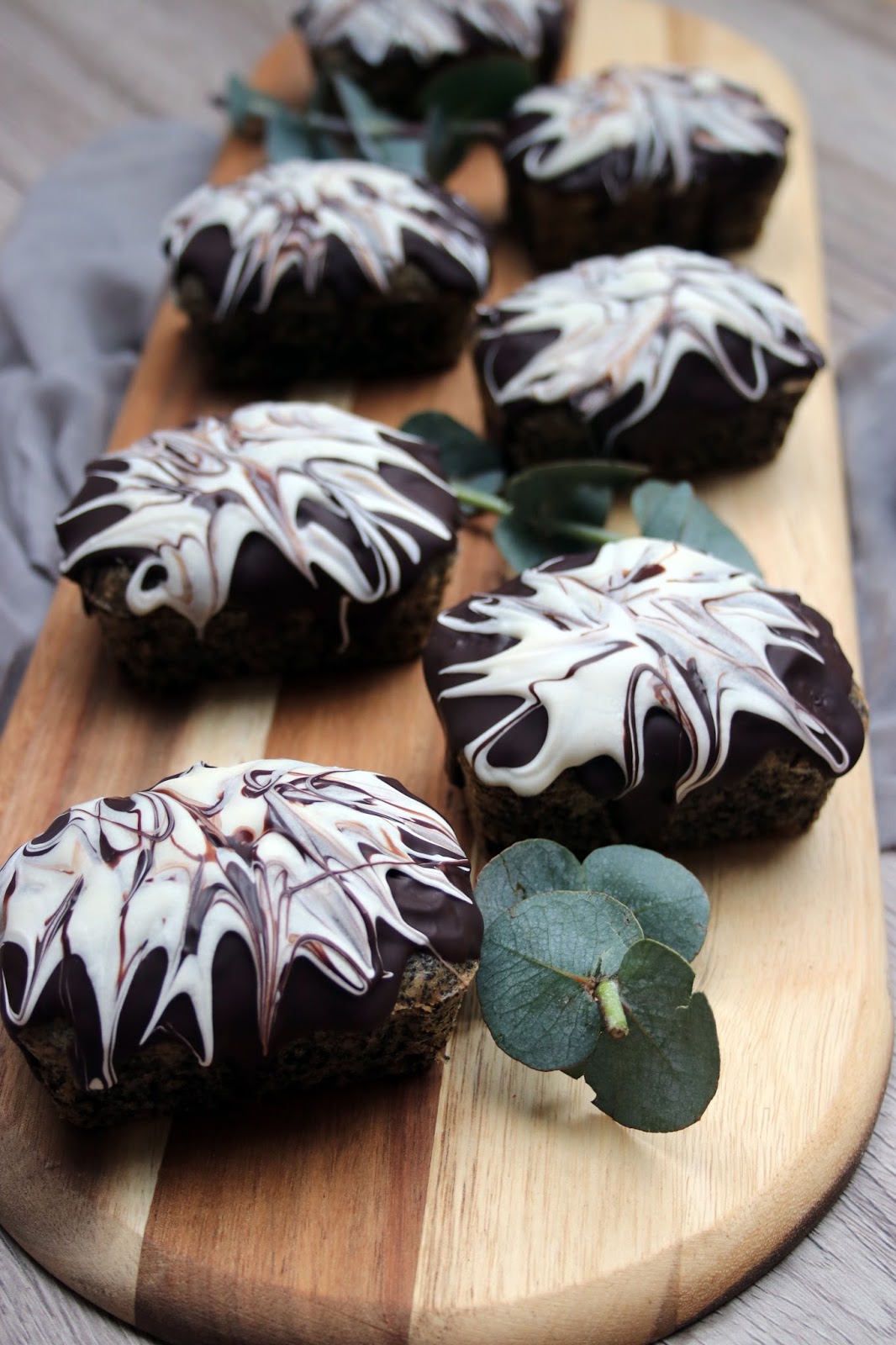 In der Zwischenzeit schmelzt ihr die dunkle und die weiße Schokolade jeweils in einem Wasserbad. Gebt dann zunächst die dunkle Schokolade auf die Kuchen. Dann gebt ihr jeweils einen Löffel weiße Schokolade mittig auf die Küchlein. Mit einem Zahnstocher könnt ihr dann Muster in die Schokolade ziehen.