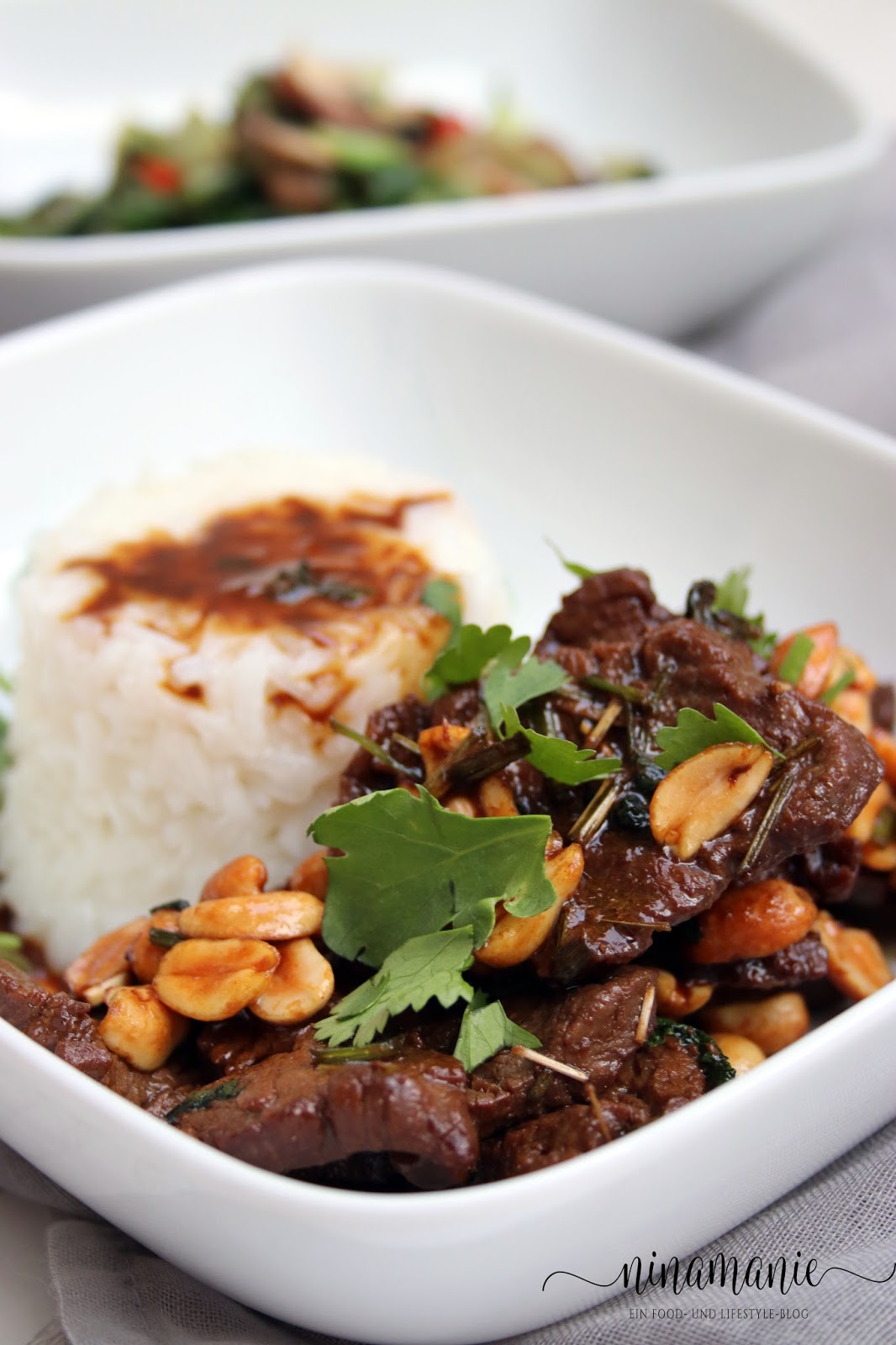 Kurz vor dem Servieren das Fleisch mit der Marinade etwa 3 Minuten in einer heißen Pfanne kurz anbraten. Mit Korianderblättchen und zerstoßenen Erdnüssen bestreut servieren.
