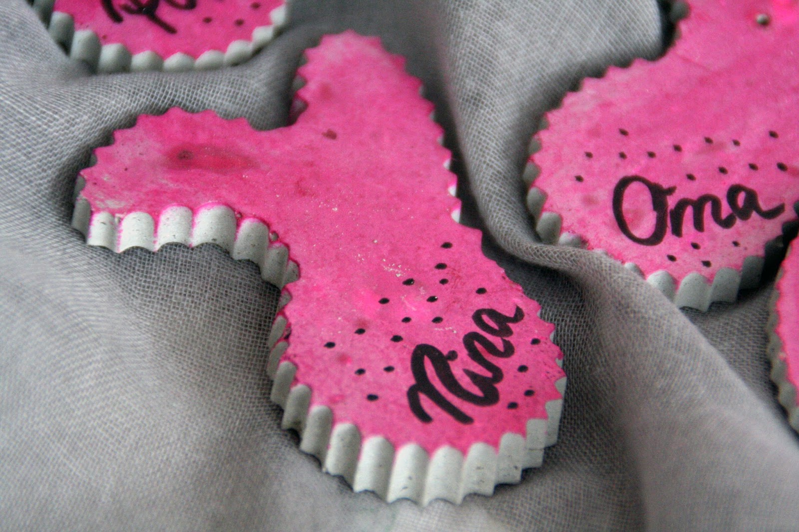 Für die Ostertafel habe ich auch schon kleine Beton-Häschen und Beton-Eier gebastelt, mit dem Farbtuch eingefärbt und beschriftet – die werden als Namensschilder und Tischdeko verwendet.
