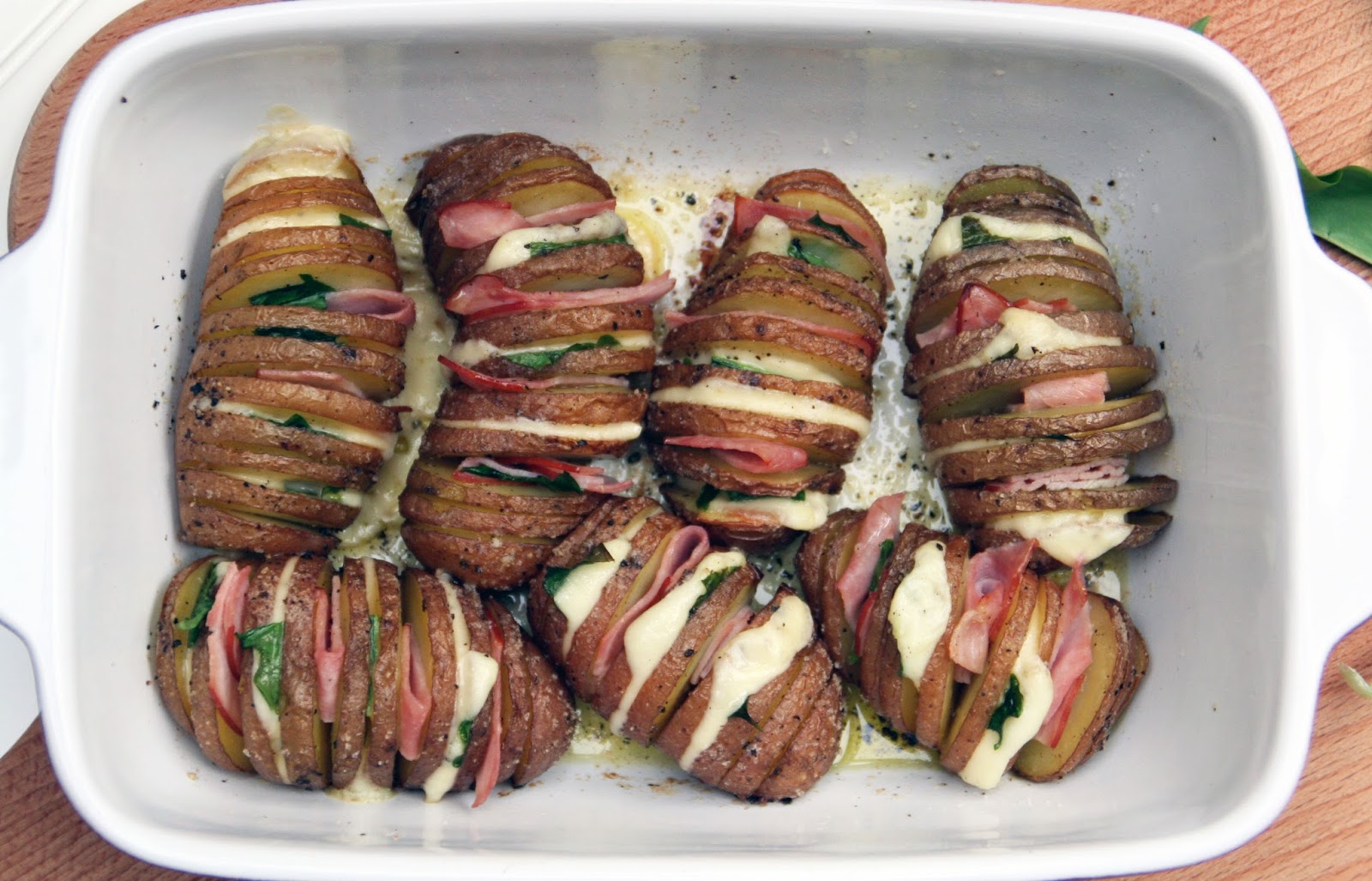 Nehmt die Auflaufform heraus und gebt nun abwechselnd Schinken und Gauda in die Kartoffelspalten. Und je nachdem, wie intensiv ihr den Bärlauchgeschmack haben möchtet, gebt ihr in jede oder eben nur in einige Spalten ein Stückchen von einem Bärlauchblatt hinzu.