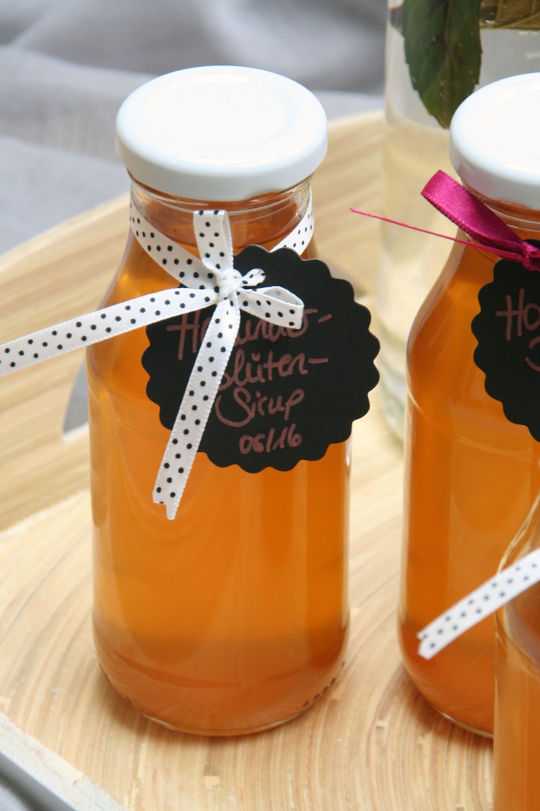 Nach den drei Tagen gießt ihr den Sirup durch ein feines Sieb in einen Topf ab. Bringt den Sirup noch einmal zum Kochen, lasst ihn 2 Minuten sprudelnd kochen und füllt ihn dann noch heiß in Fläschchen. Stellt die Flaschen sofort für etwa 5 Minuten auf dem Kopf.