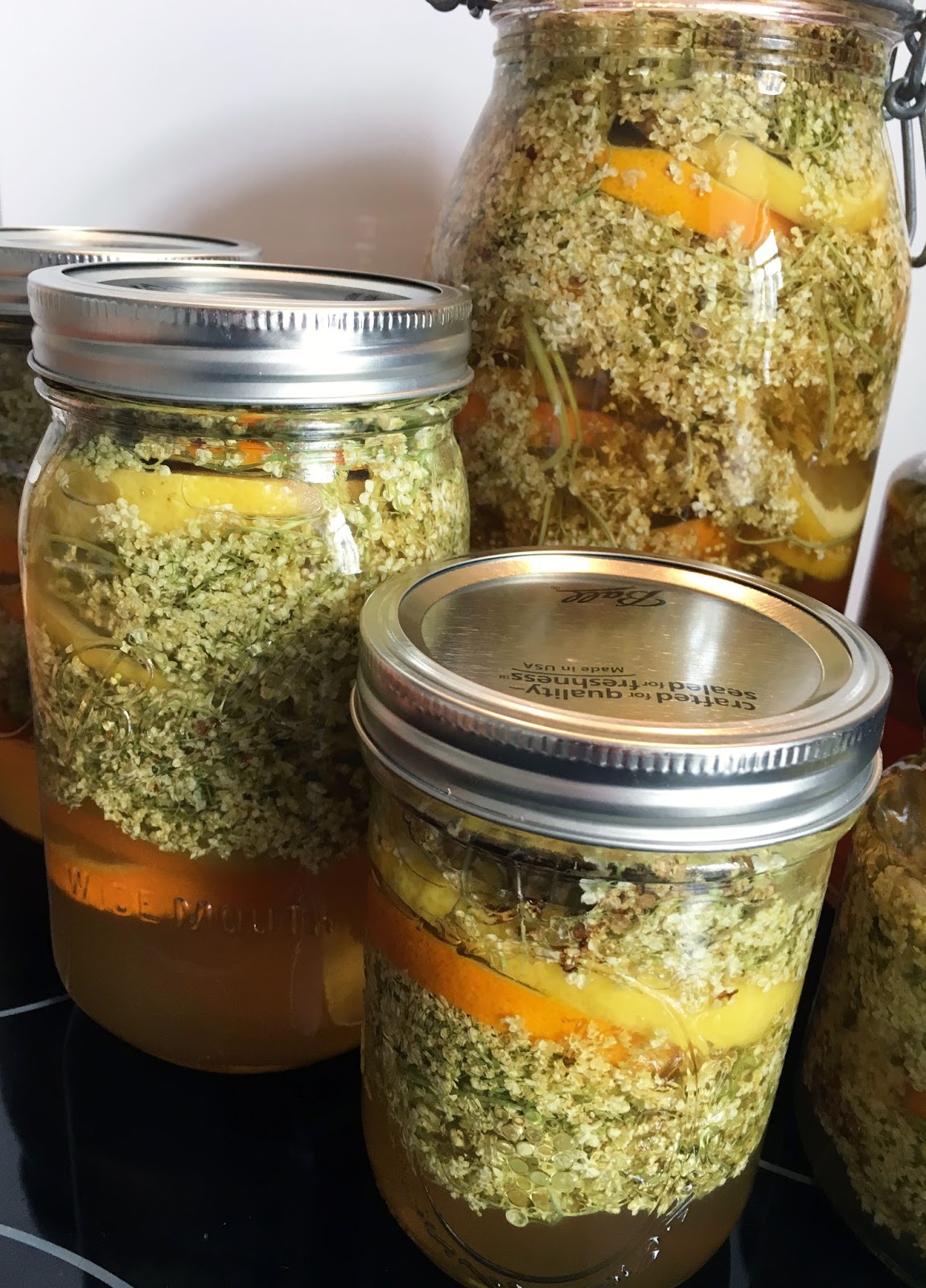 Schichtet in ein großes, hohes Einmachglas abwechselnd die Holunderblütendolden, die Zitronen- und Orangenscheiben. Wenn ihr kein so großes Glas habt, müsst ihr es eben auf mehrere Gläser aufteilen, das geht natürlich auch.