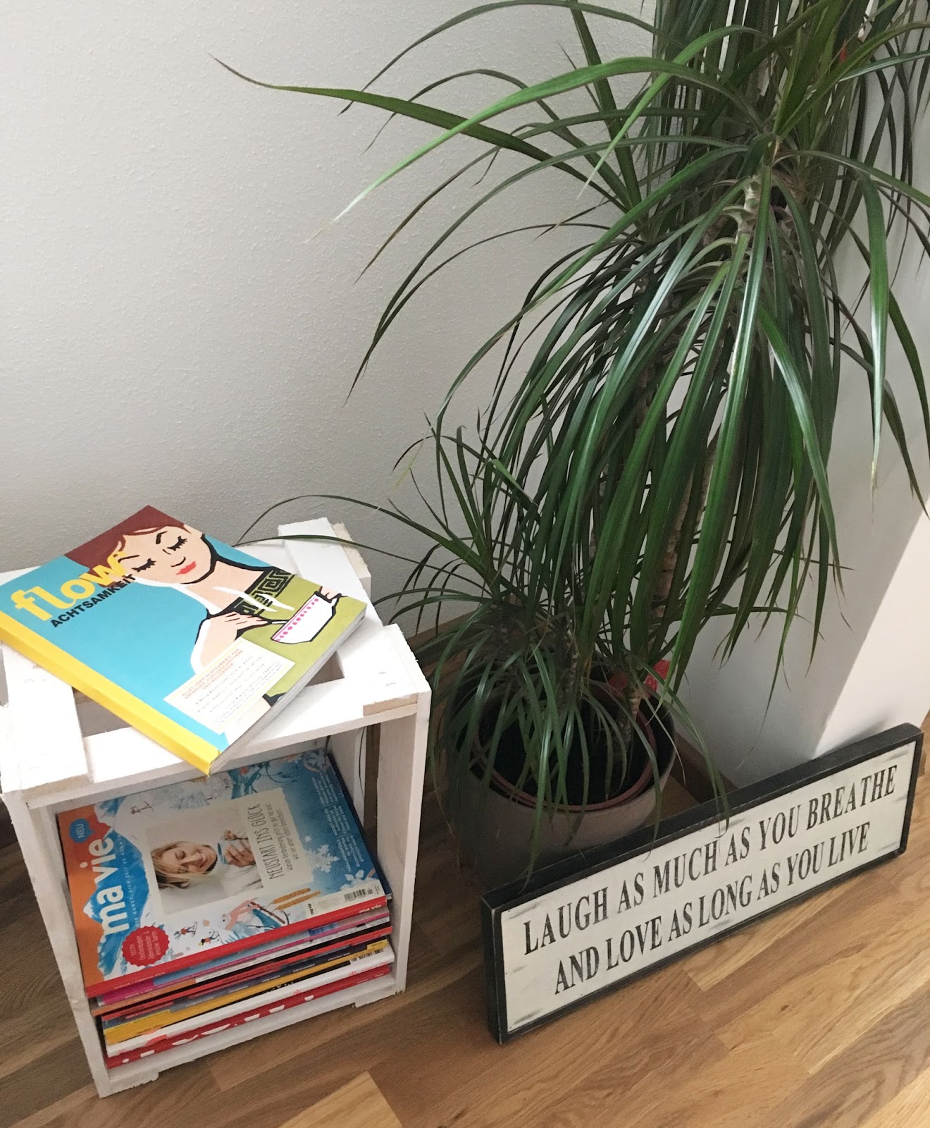 Meine Weinkisten sind jetzt weiß und fungieren als Zeitschriften- und Bücherregal.