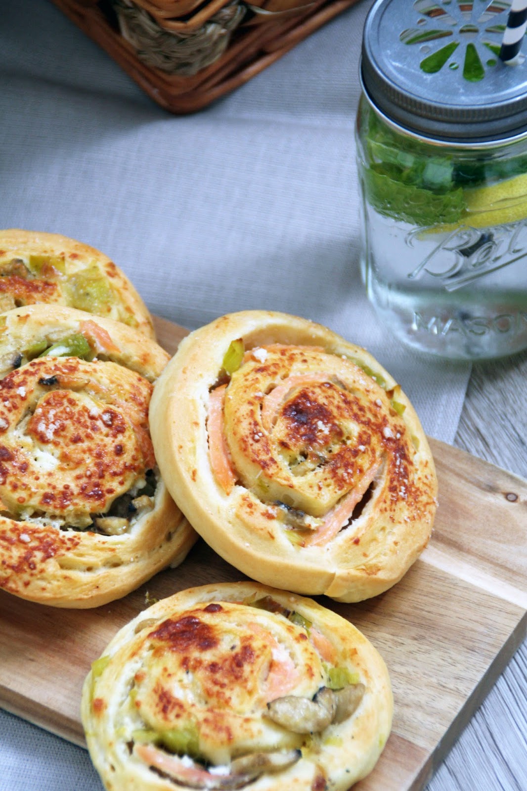 Ich habe mich diesmal für Hefeschnecken mit einer Füllung aus Ziegenfrischkäse, Lauch, Champignons und Lachs entschieden. Mmmmmhhhh….