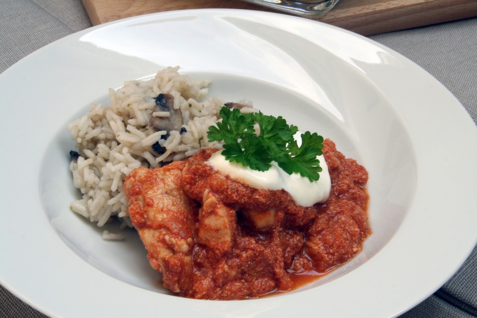 Gebt dann großzügig Pfeffer, das Paprikapulver und das Tomatenpüree hinzu. Lasst alles bei mittlerer Hitze etwa 20 Minuten an. Dann kommt der Joghurt dazu, lasst alles weitere 5 Minuten köcheln.