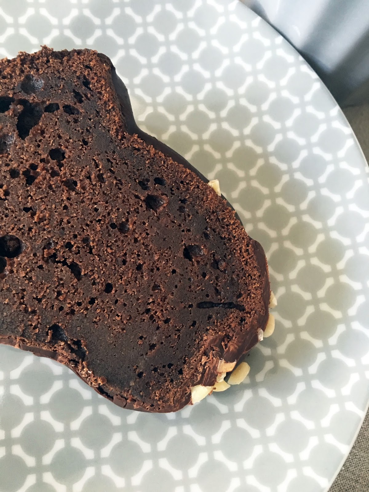 Für den Guss habe ich 2 Tafeln dunkle Schokolade im Wasserbad geschmolzen, über den Kuchen gegeben und dann noch etwas Mandelsplitter darüber gestreut.