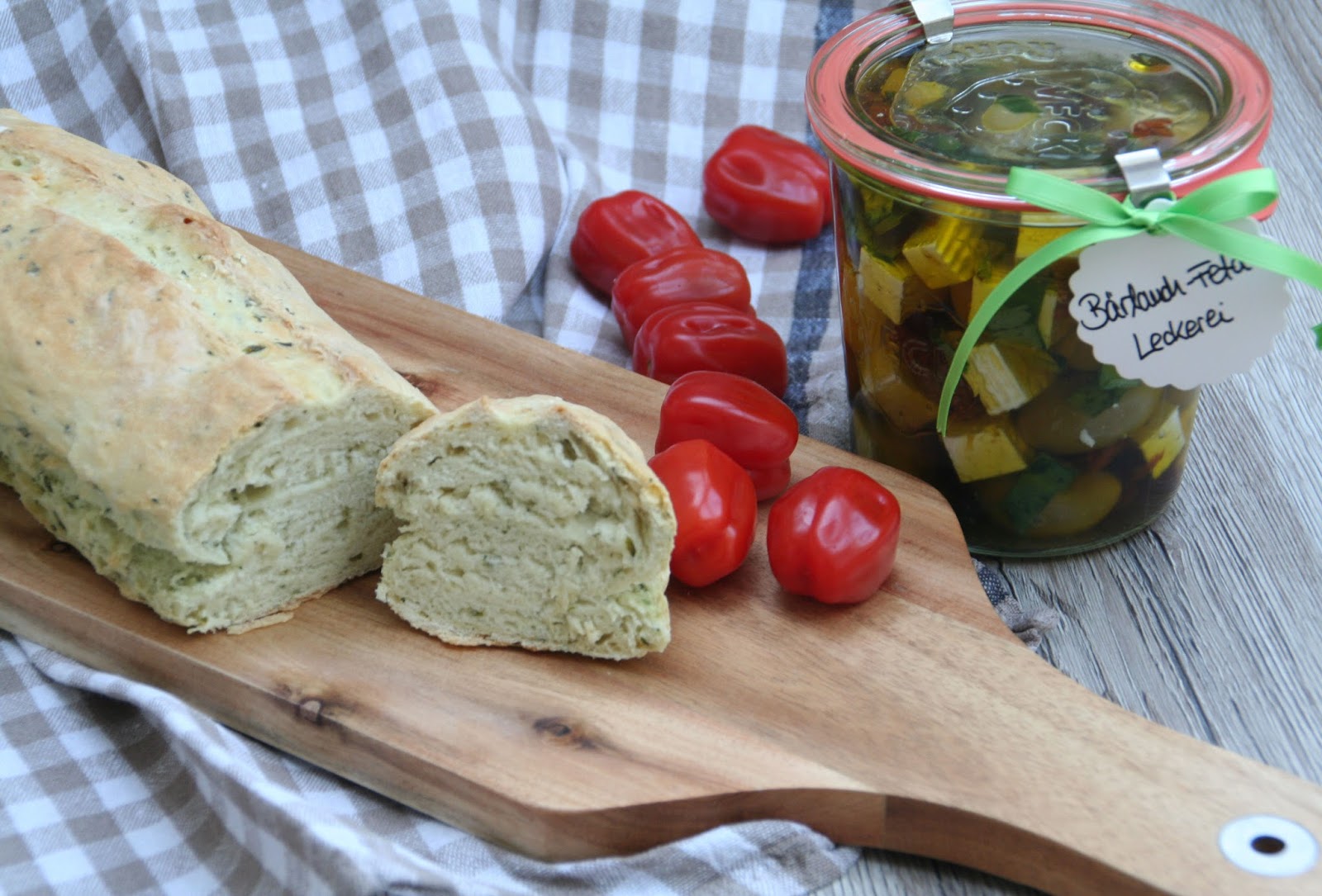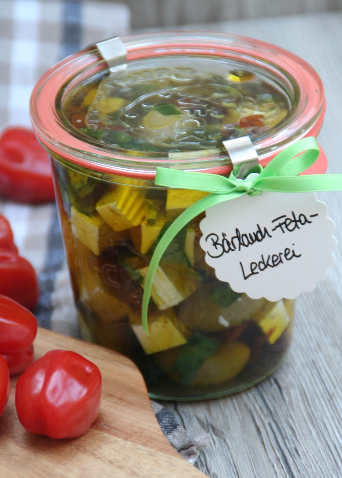 Und da ich noch nicht genug von Bärlauch habe, habe ich gleich auch noch Fetakäse zusammen mit in Streifen geschnittenem Bärlauch, getrockneten Tomaten und Oliven in Öl eingelegt. 2 Tage ziehen lassen und dann genießen.