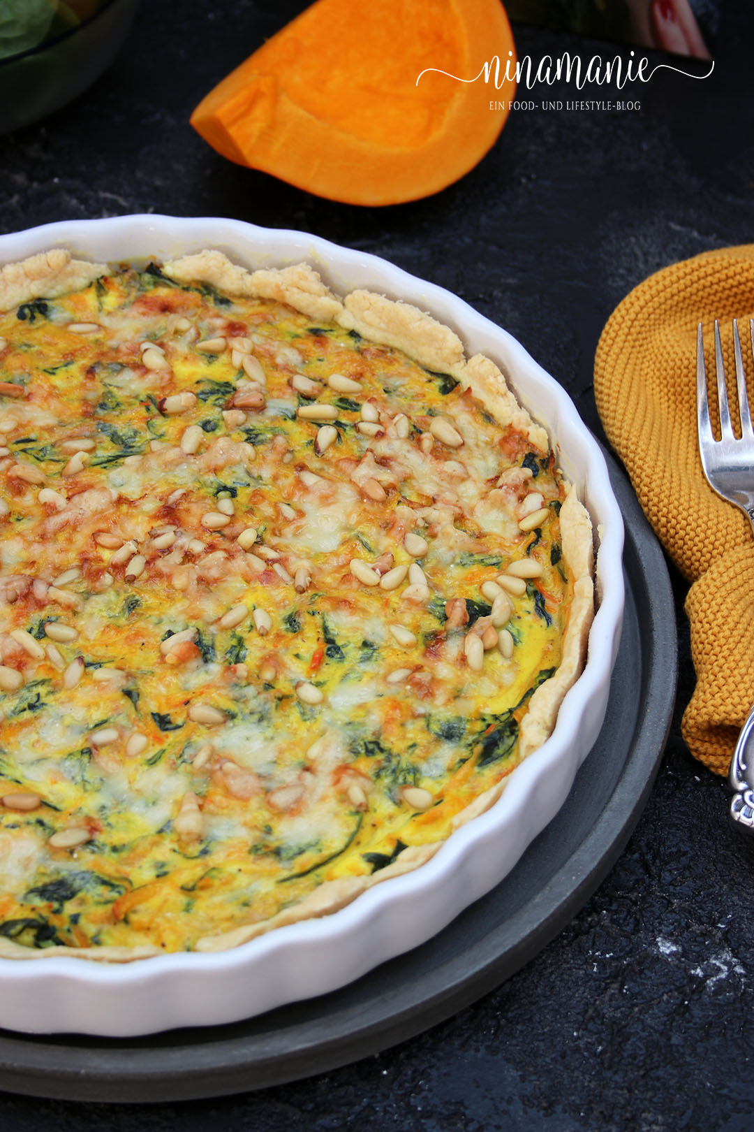 Mürbeteig auf einer bemehlten Arbeitsfläche ausrollen. Tarteform einfetten und mit Mehl bestäuben. Mürbeteig in die Form legen und Kürbis-Spinat-Mischung darauf verteilen. Käse grob reiben und mit dem restlichen Kürbis und den Pinienkernen auf der Spinat-Kürbis-Quiche verteilen. Quiche etwa 30 Minuten backen.